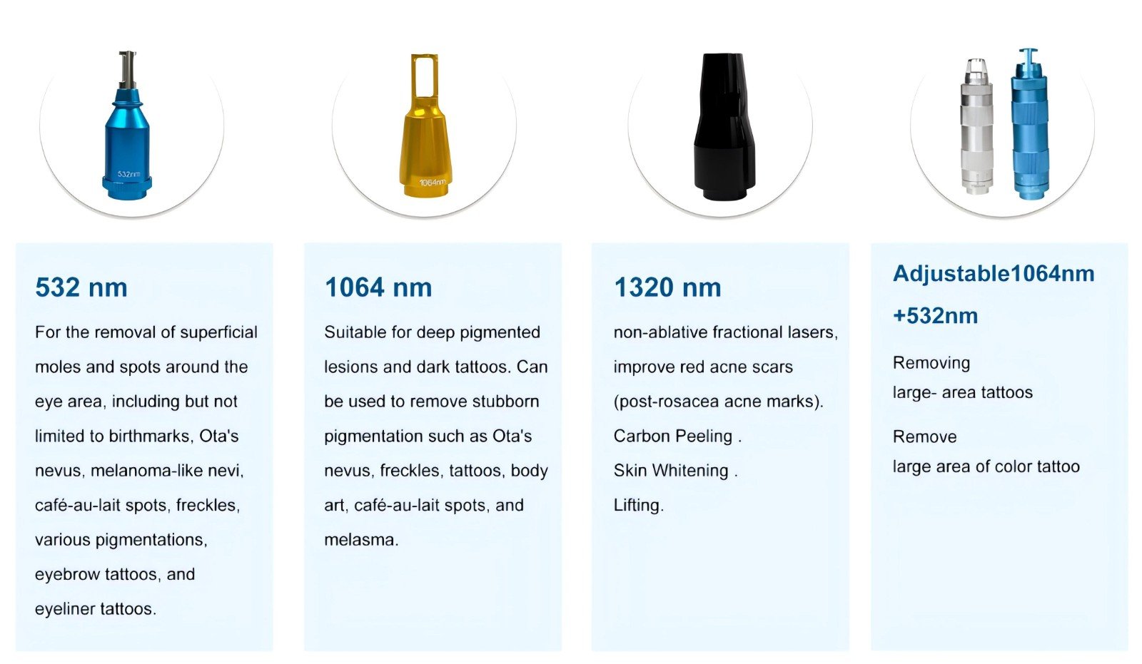 El instrumento incorpora un módulo láser ND YAG, que ofrece innovadoras tres longitudes de onda: 532 nm, 1064 nm y 1320 nm. También admite un modo de longitud de onda dual ajustable de 1064 nm + 532 nm, que se puede ajustar con flexibilidad según el tipo y la profundidad de los problemas de la piel para lograr un tratamiento preciso y por capas. Aborda múltiples problemas de la piel, como la pigmentación, las arrugas y la textura áspera, en un solo paso, y tiene el doble efecto de eliminar manchas y purificar la piel, además de antienvejecimiento y rejuvenecer la tez.